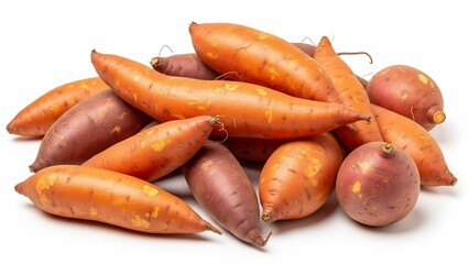 Many raw sweet potatoes isolated on white