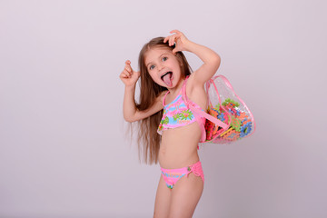 Cute little girl in swimsuit with drink on light blue background