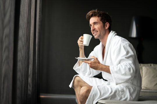 Young woman wearing white bathrobe opening curtains in luxury hotel room enjoying sun in the morning.
