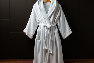 White bathrobe hanging on a hook beside a steamy mirror, creating a serene atmosphere in a modern, minimalist bathroom design, created with generative ai