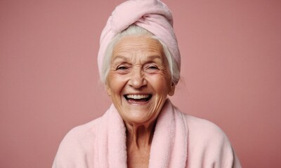Beauty portrait of attractive senior woman wearing bathrobe and towel wrapped around her head against pink background. Headshot of laughing female elderly model after spa treatment, skincare routine