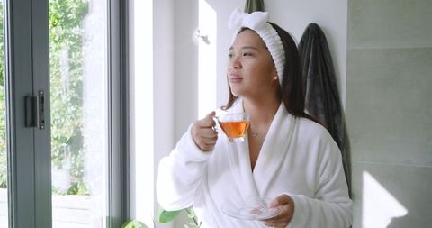 Woman relaxing in bathrobe holding hand on face with digital abstract overlay