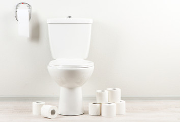 Toilet paper with sad emoticon on toilet bowl in modern restroom