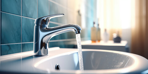 Water faucet, closeup. Running water in bathroom sink. Modern clean house, washing hands and Hygiene concept.