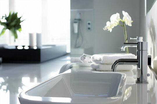 Modern bathroom sink with chrome faucet on white counter, white towels nearby. Elegant orchid in background. Shallow depth of field