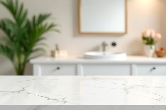 Empty marble top table with blurred bathroom interior Background. for product display montage
