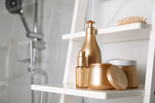 Soft light bathroom decor for advertising, design, cover, set of cosmetic bottles, bath accessories, white small flowers in vase, towel on white wooden shelf. mock up,copy space