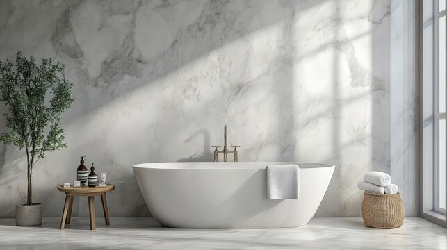 Bathroom interior with marble panels bathtub towels and accessories contemporary style design