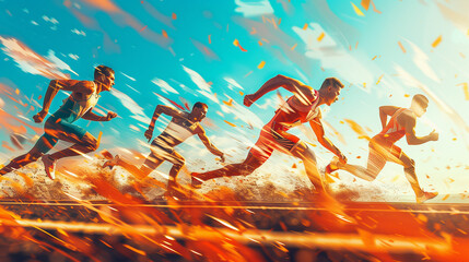 Hazy movement men sprinters exchanging baton in relay competition.