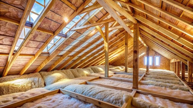 A well-organized attic space with fiberglass batt insulation, vented roof, and radiant barrier reflecting heat for energy efficiency.