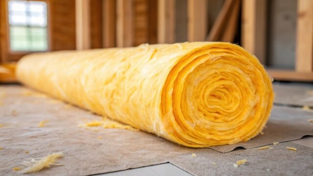 A closeup of a fiberglass batt insulation roll partially unrolled on the floor revealing its vibrant color and texture. The fibers are dense and compacted showing its effectiveness