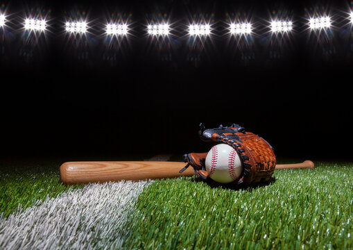 Baseball batt glove and ball low angle on grass field with stripe below lights at night