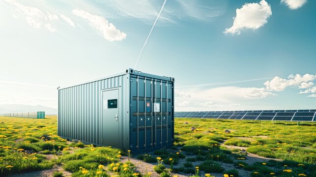 Battery storage container next to a bank of ground based solar panels in a green field. Generative AI.