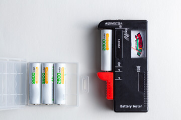A black plastic battery tester with a clamp on the side that different types of batteries can be inserted so that their charge levels can be measured. Thel level is displayed on the side with a needle