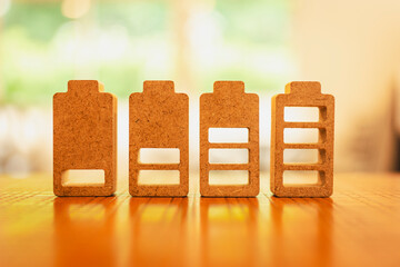 Battery charge indicator wood model. Phone charge level. Discharged and fully charged battery. Battery charge from high to low.