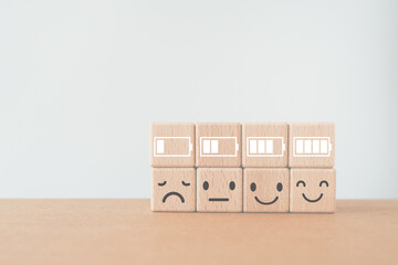 Level of  battery and emotional face on wooden cube blocks. For  energy life, emotion Level, world mental health day, passion, Happy Life, Satisfaction, Full energy and Positive thinking