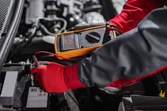 Close-up view of a mechanic with tools performing a battery diagnostic test in a car repair shop.