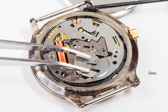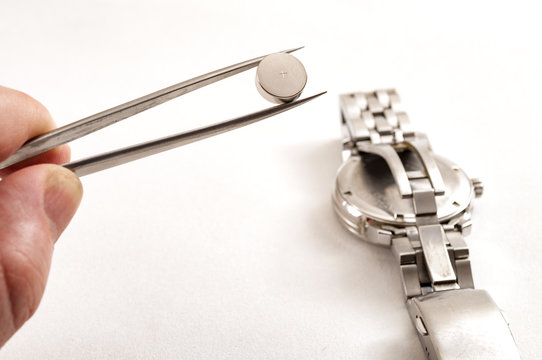 A man use pliers to clamp the digital watch battery remove and change in repairing broken wristwatches on white table