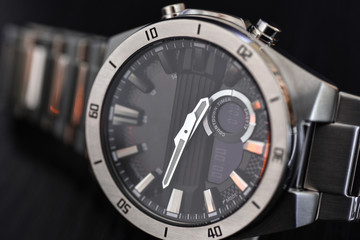 Luxury quartz watch with analog hands and a digital display and a solar battery, tachometer