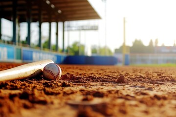 A baseball bat and ball lay on the dirt in a well-lit stadium, capturing the spirit of practice