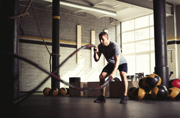 Crossfit battling ropes at gym workout exercise. Crossfit