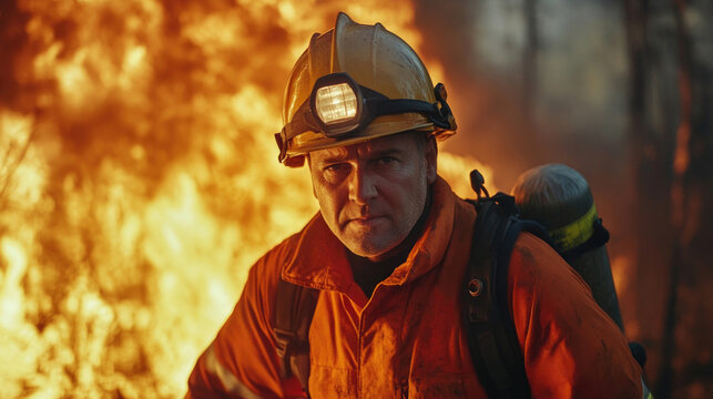 Firefighter stands amidst blazing trees, smoke and firelight surrounding him, a hero battling the destruction of the forest and climate-driven wildfires.