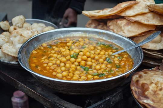 Chole bhature is a North Indian food dish. A combination of chana masala and bhatura or puri. ai generated