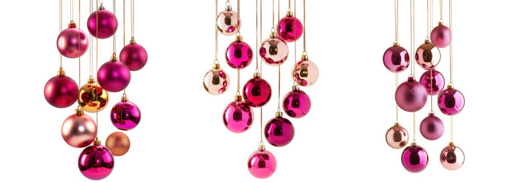 A collection of pink and gold christmas baubles hanging in clusters, isolated on transparent background
