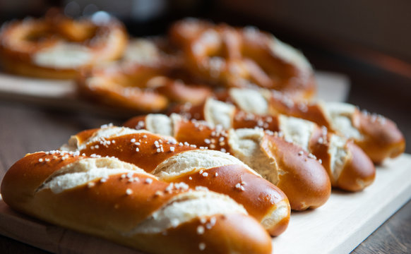 Closeup photo of lye bun and bavarian pretzel in bakery