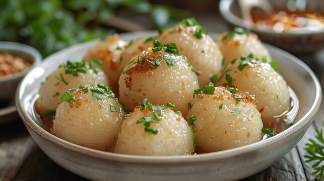 Burmese mont lone yay baw sticky rice balls jaggery filling served in a white bowl
