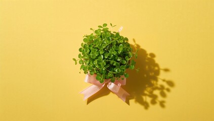 Growing microgreens with pink baw on yellow background, suitable for educational gardening materials