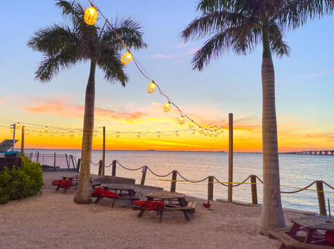 A tropical restaurant party area along the ocean bay water in Tampa Florida. This area is ideal for open air party spaces with beautiful sunrises and a pretty travel destination in Florida summertime.