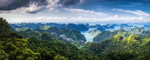scenic view over Ha Long bay from Cat Ba island, Ha Long city in the background, UNESCO world heritage site, Vietnam