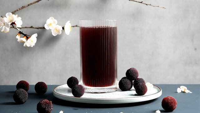 A cup of bayberry juice Chinese-style creative scene commercial photography