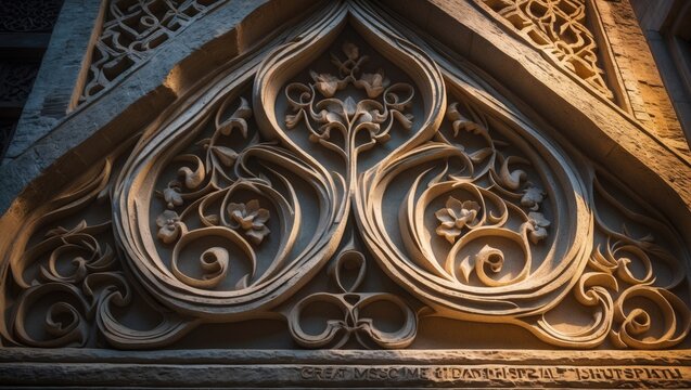 An ancient building featuring artistically crafted stonework. Architectural details from the Great Mosque and Hospital, with floral and geometric motifs.