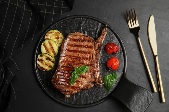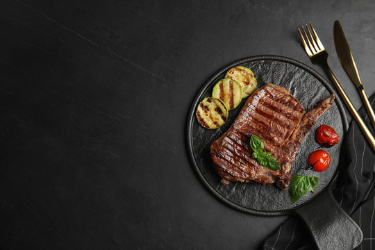 Flat lay composition with grilled meat steak on black table