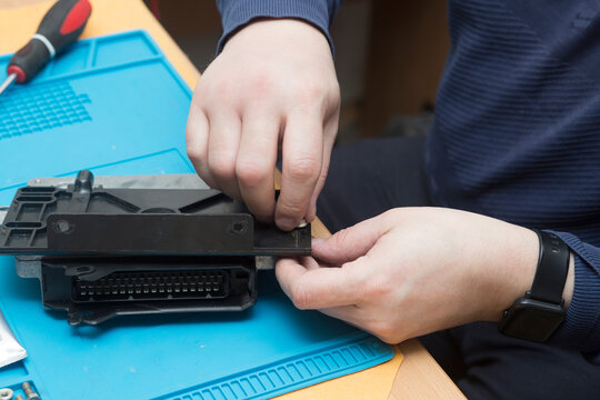 EV Body & Chassis Control ECU with Transparent Circuit View and Neon Network Icons – EV BCM System Integration Concept
