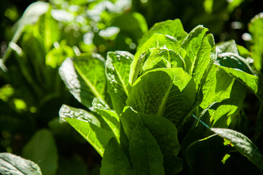 Vibrant green baby cos lettuce leaves on a matching backdrop, detail, salad ingredient