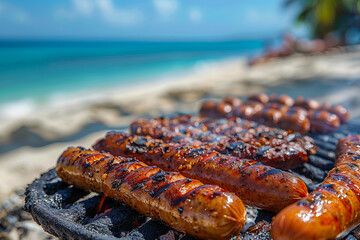 A barbecue on a warm beach, with friends gathered around a grill, festive decorations, and palm trees. Generative AI