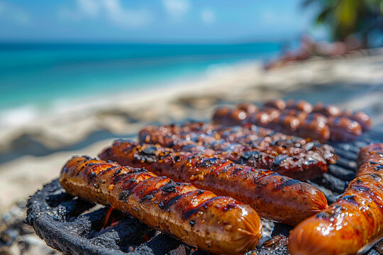 Sausages sizzling on charcoal grill with toasted bread and smoky summer barbecue