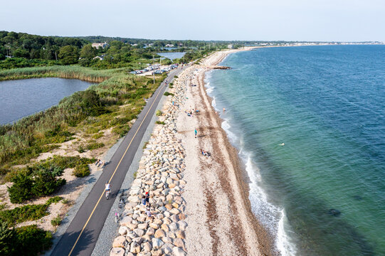 Aerial Drone of Woman biking Cape Cod beaches coastal bike path