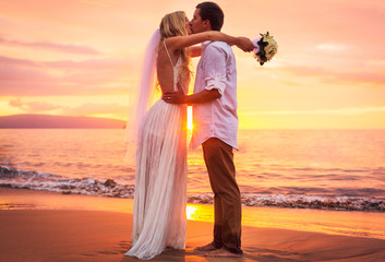 Romantic beach wedding for loving couple at sunset