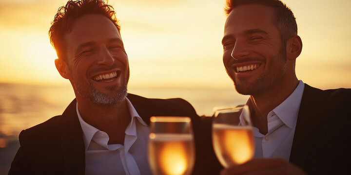 Male couple celebrating by clinking wine glasses at sunset on the beach