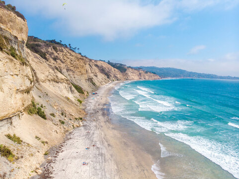 The bay of Torre dell'Orso, with its high cliffs, in Salento, Puglia, Italy. Turquoise sea and blue sky. A beach of fine white and pink sand. The stacks called the Two Sisters. Tourists sunbathe.