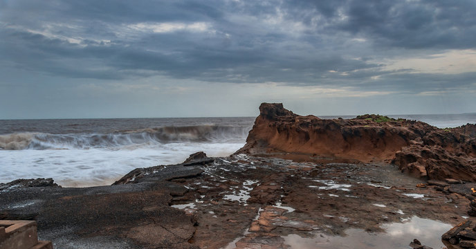 Stormy coastline with dramatic rocky cliffs and turbulent waves