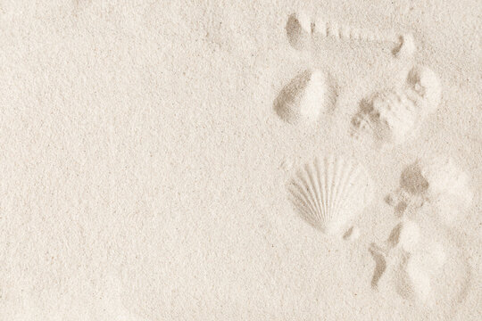 Texture of beach sand with seashells imprint. Beach sand texture in summer sun. Seashells on sand beach