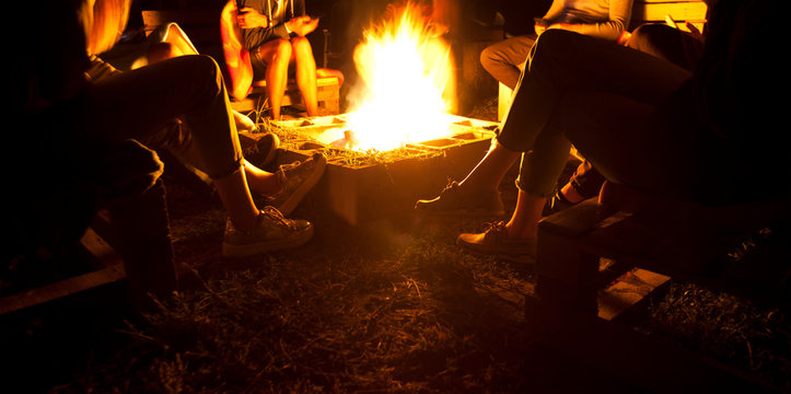 Summer camp. children camping on beach and sitting by the fire  on a summer evening