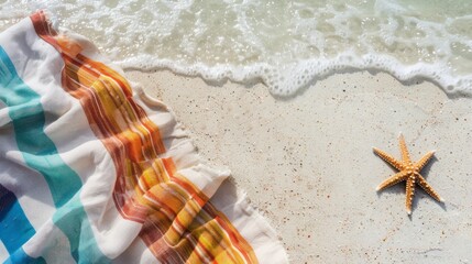 Hat on a blanket on sandy beach with ocean wave in background
