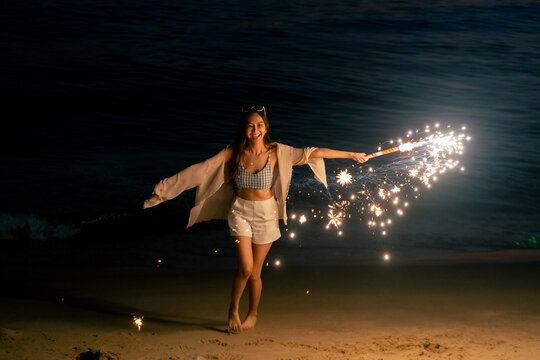 Happy Asian woman travel nature the sea on summer beach holiday vacation. Beautiful woman enjoy and fun outdoor lifestyle dancing party and playing sparklers firework on tropical beach at night.
