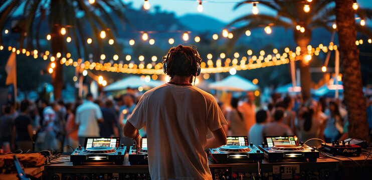 A close-up shot of hands on turntables, with people dancing in soft focus behind at sunset during an outdoor party. A photo of DJ equipment on the beach with a sunset and crowd in the background.